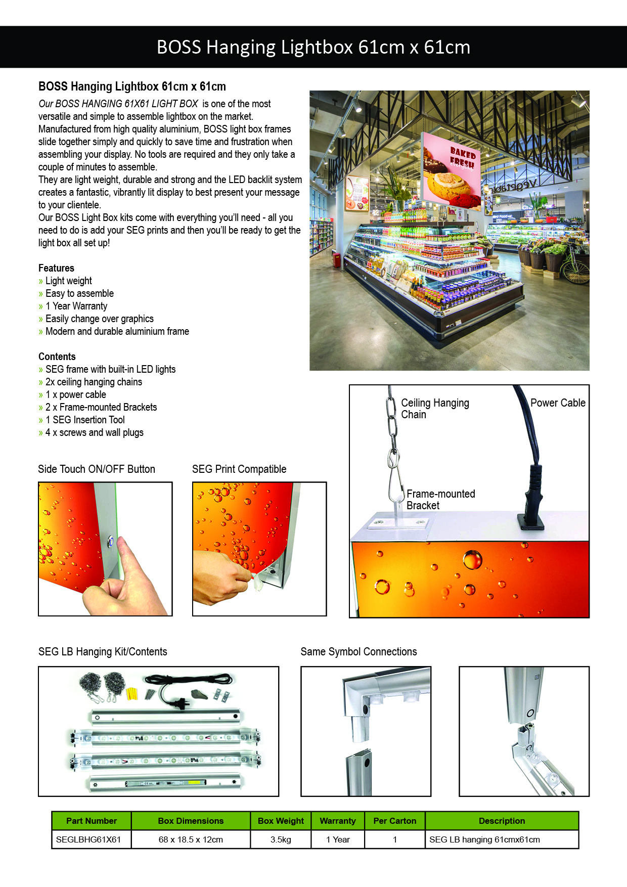 Our BOSS HANGING 61X61 LIGHT BOX is one of the most versatile and simple to assemble lightbox on the market. Manufactured from high quality aluminium, BOSS light box frames slide together simply and quickly to save time and frustration when assembling your display. No tools are required, and they only take a couple of minutes to assemble. They are light weight, durable and strong and the LED backlit system creates a fantastic, vibrantly lit display to best present your message to your clientele.