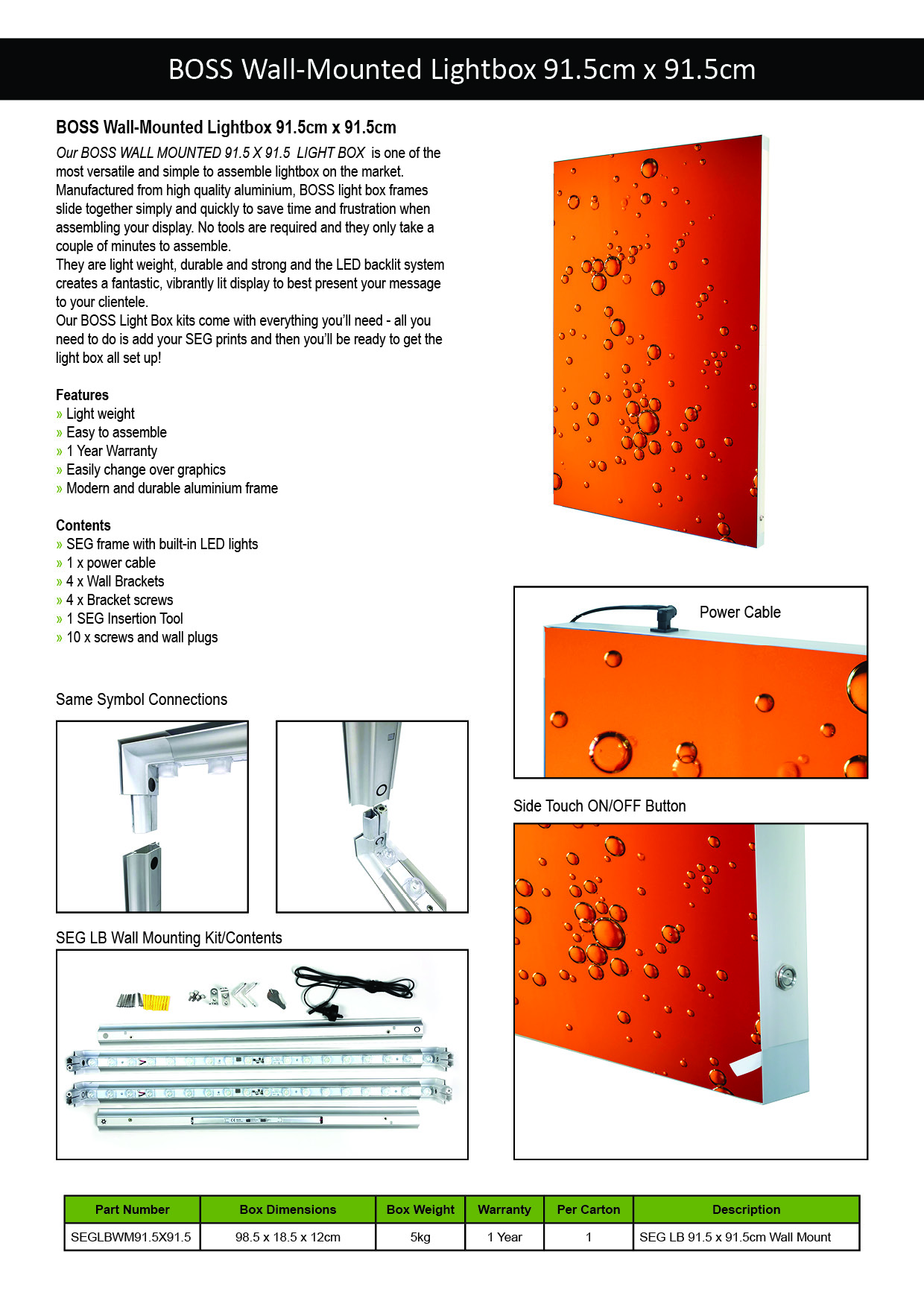 Our BOSS WALL MOUNTED 91.5X91.5 LIGHT BOX is one of the most versatile and simple to assemble lightbox on the market. Manufactured from high quality aluminium, BOSS light box frames slide together simply and quickly to save time and frustration when assembling your display. No tools are required, and they only take a couple of minutes to assemble. They are light weight, durable and strong and the LED backlit system creates a fantastic, vibrantly lit display to best present your message to your clientele.