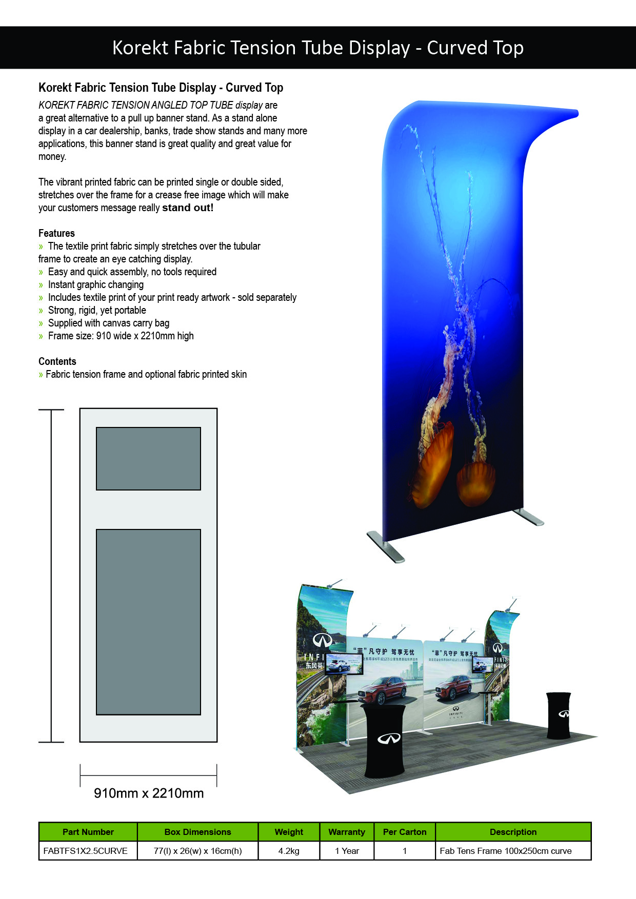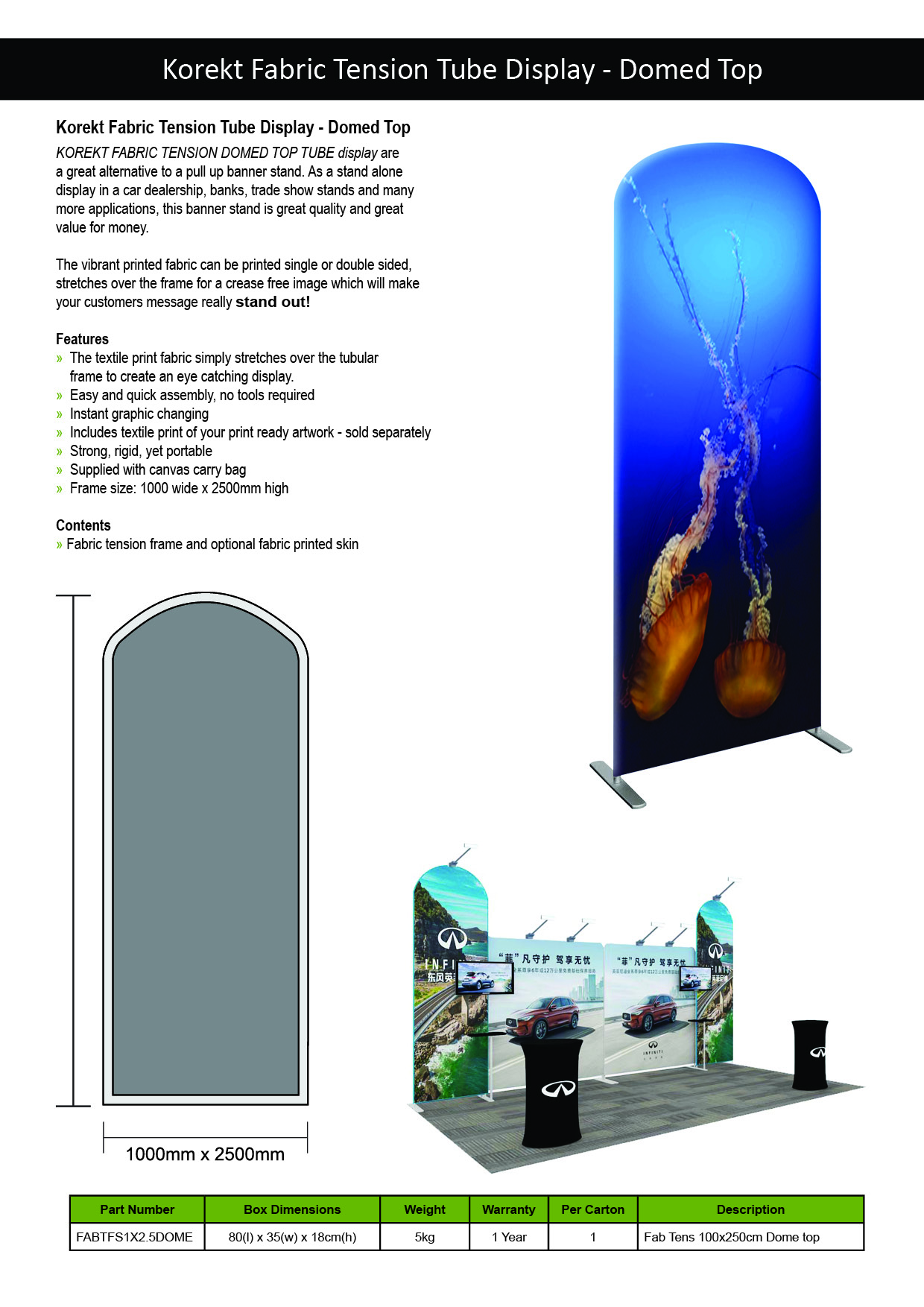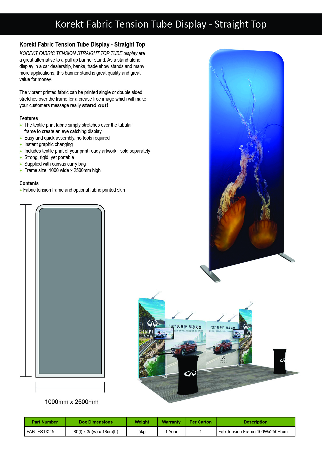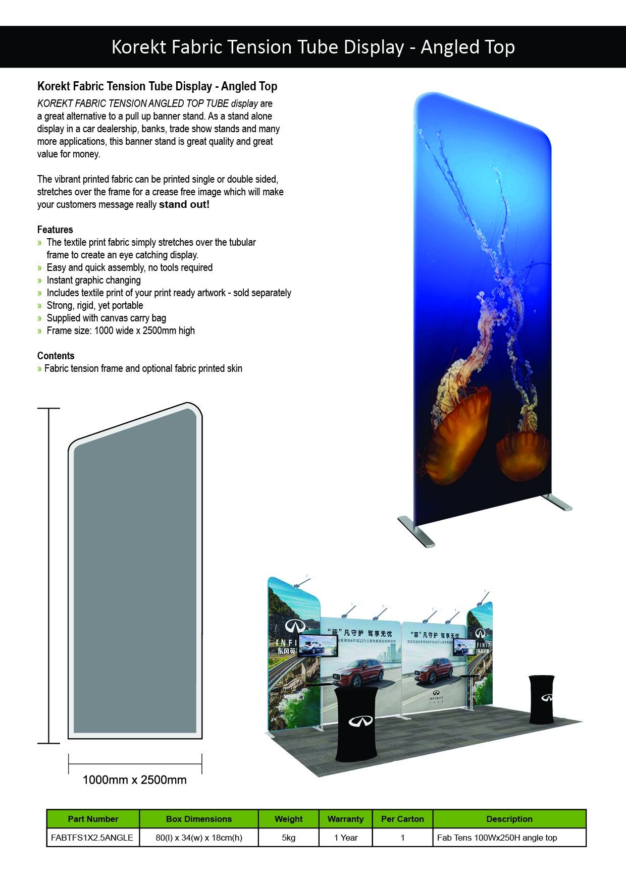 KOREKT Modular Exhibition Displays are a flexible, easy-to-assemble system ideal for creating custom trade show booths and shell schemes. Using 1m and 2m wide fabric tension panels, you can build professional backdrops for 3×3, 3×6, or 6×6 booth setups. With over 10 compatible components—including tables, TV stands, brochure holders, and lighting—you can design a fully branded and functional exhibition space tailored to any event or layout.