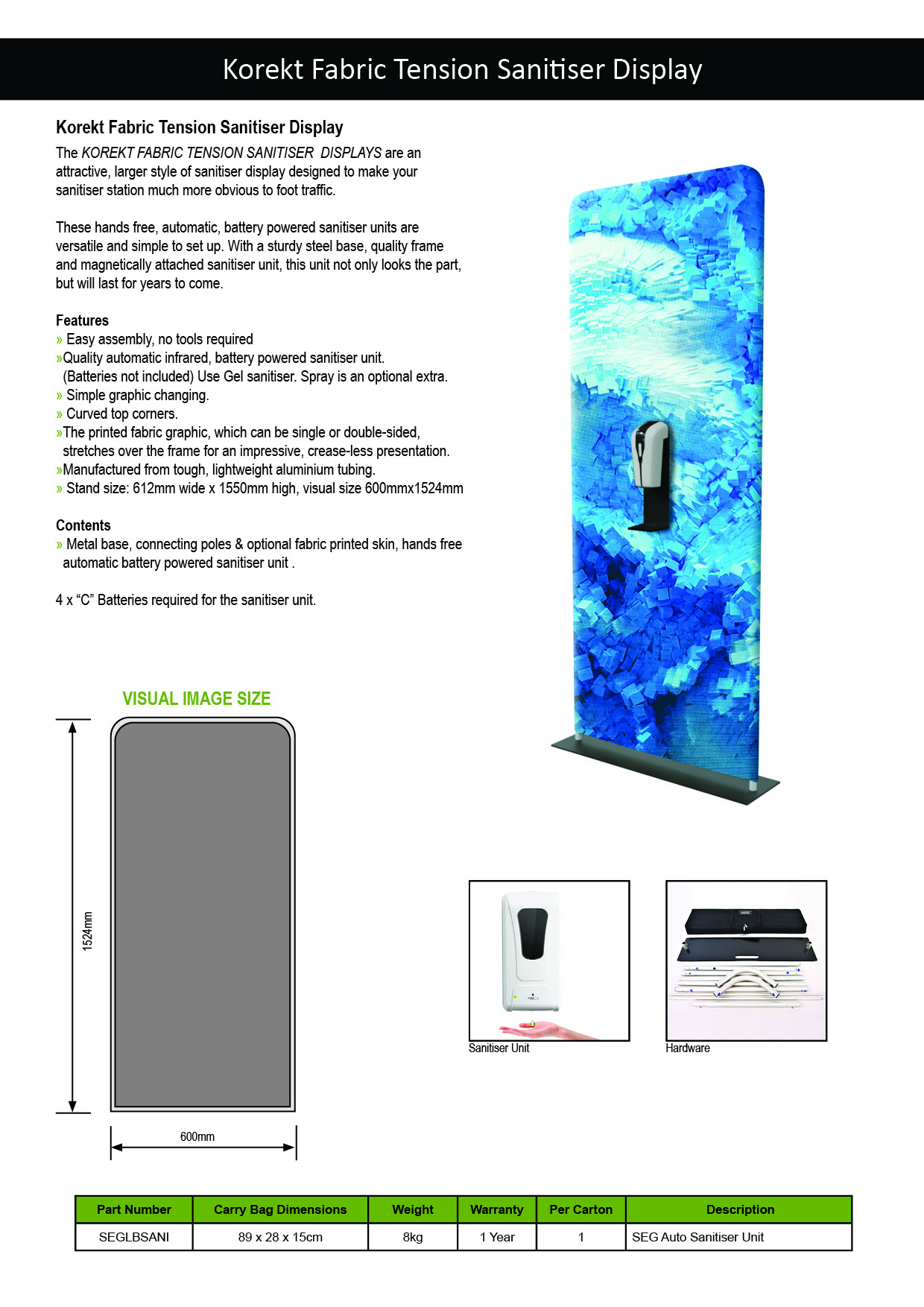 The KOREKT Fabric Tension Sanitiser Display is a high-impact, hands-free sanitiser station designed to grab attention in busy spaces.