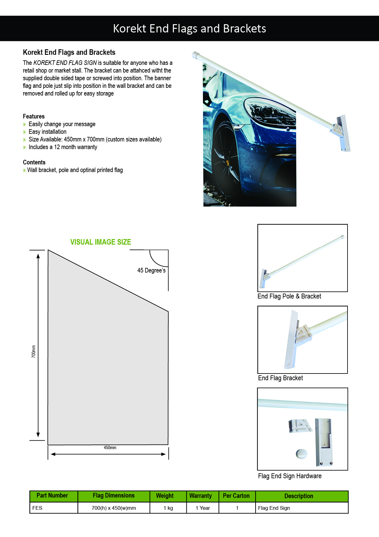The KOREKT END FLAG SIGN is suitable for anyone who has a retail shop or market stall. The bracket can be screwed into position, or for a less invasive option you can use double sided tape to adhere to the surface that your kit will be used on. The banner flag and pole just slip into position in the wall bracket and can be removed and rolled up for easy storage