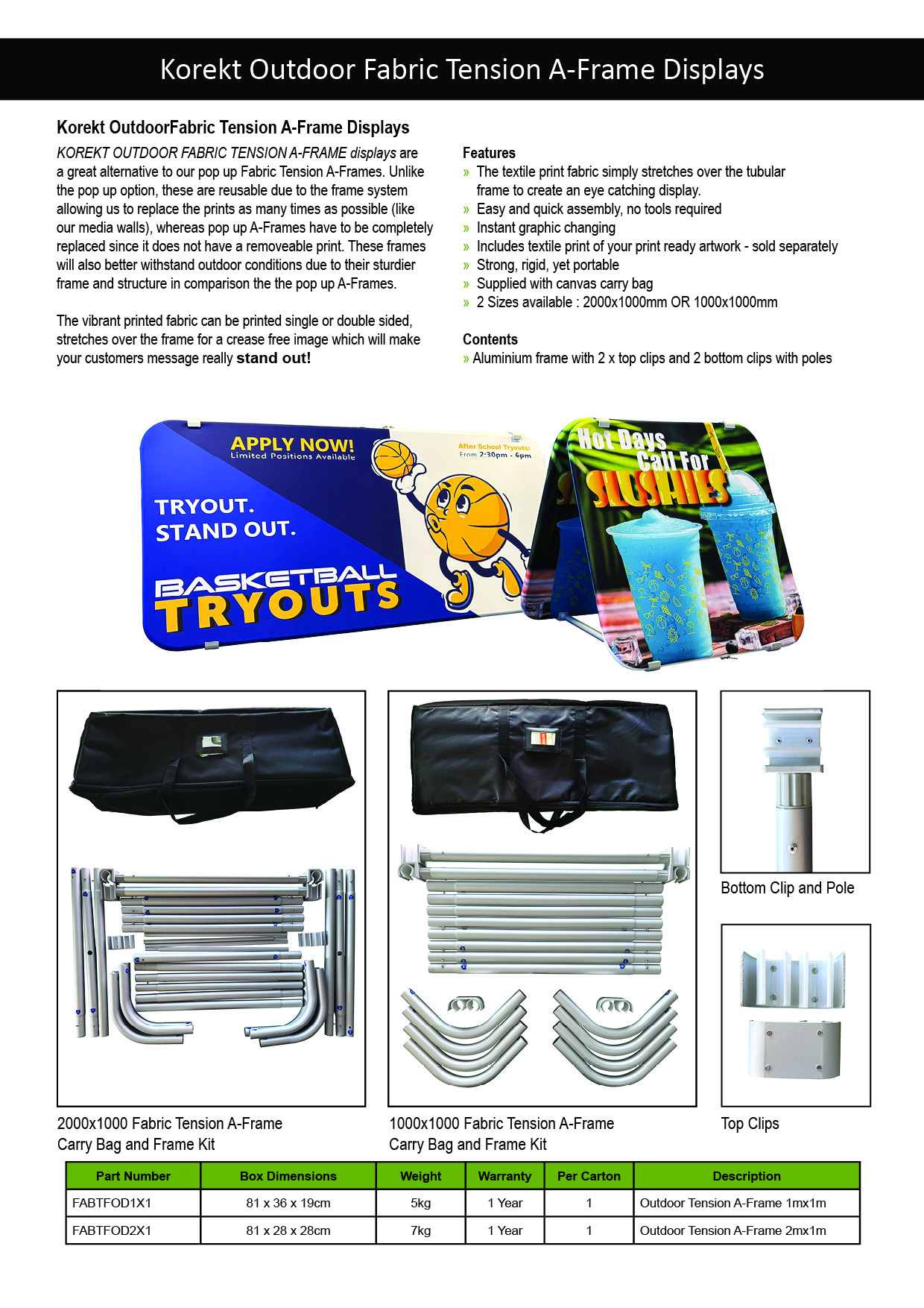 Introducing our OUTDOOR FABRIC TENSION A-FRAME – the ultimate solution for bold, effective outdoor advertising. The Outdoor Fabric Tension A-Frame is a reusable, lightweight signage solution ideal for bold outdoor branding and events. Featuring a durable click-together aluminium frame and easy-to-change fabric prints, it’s quick to set up, portable, and available in 1x1m and 2x1m sizes—making it a smarter, more sustainable alternative to traditional A-frames.