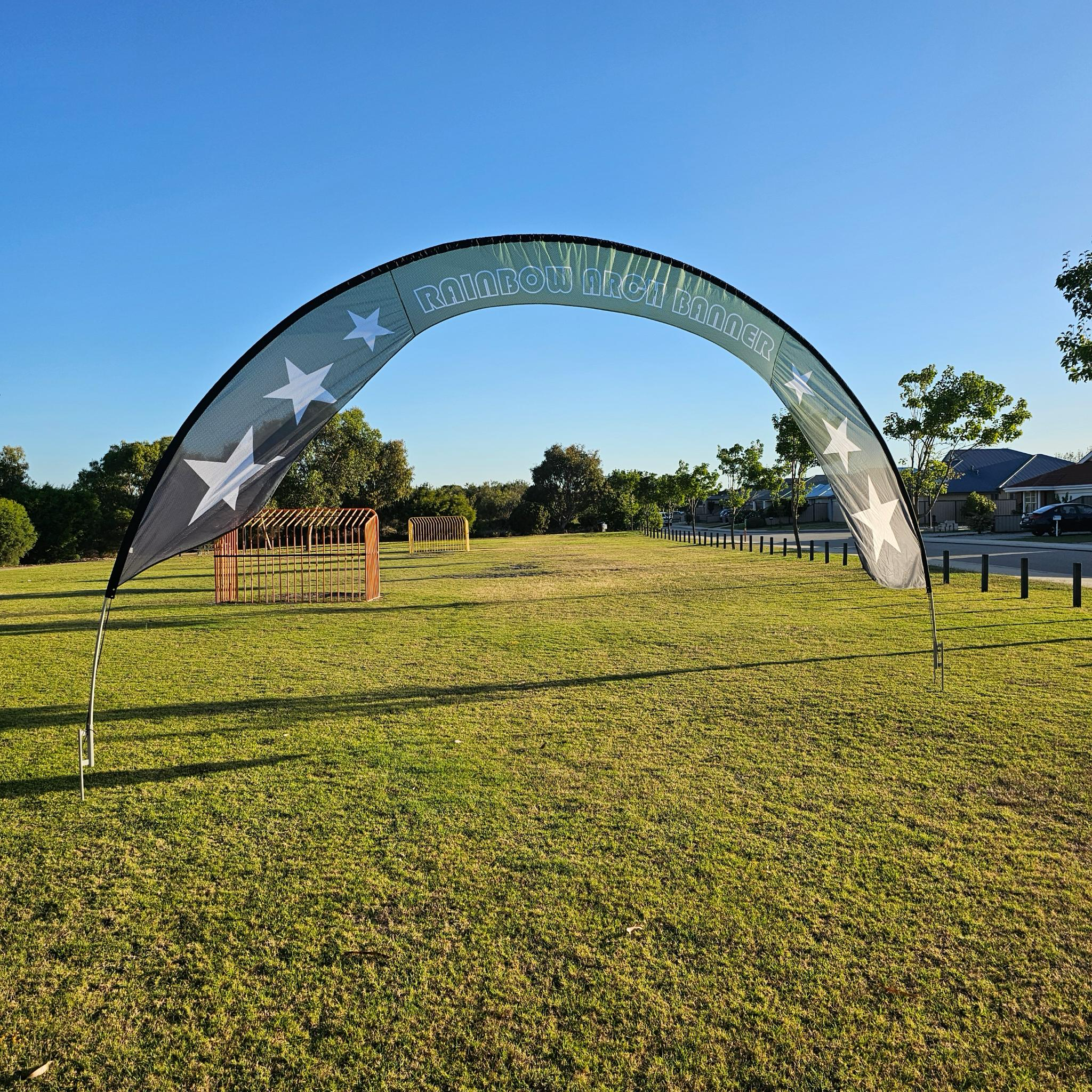 Introducing our Rainbow Banner Arch Display – a vibrant, eye-catching solution for your outdoor advertising needs. Designed for maximum visibility, this lightweight and durable display features a spacious fabric banner that stands tall using either the included ground spikes or the optional Tube Style Cross Base (sold separately) for added versatility on hard surfaces.