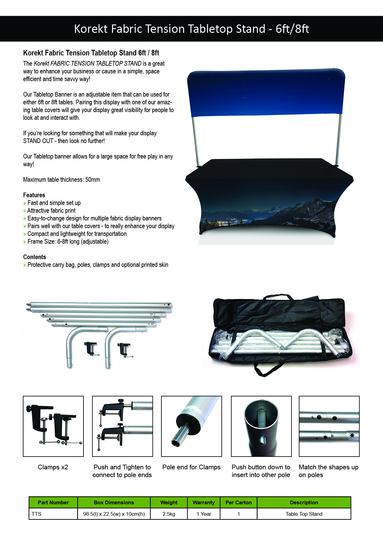 The Korekt Fabric Tension Tabletop Stand is a space-efficient and easy-to-assemble display solution designed to enhance your business or cause. Adjustable to fit both 6ft and 8ft tables, this stand provides a large, high-visibility area for your branding or messaging, making it the perfect addition to any event or trade show. Pair it with one of our table covers for an even more professional look.